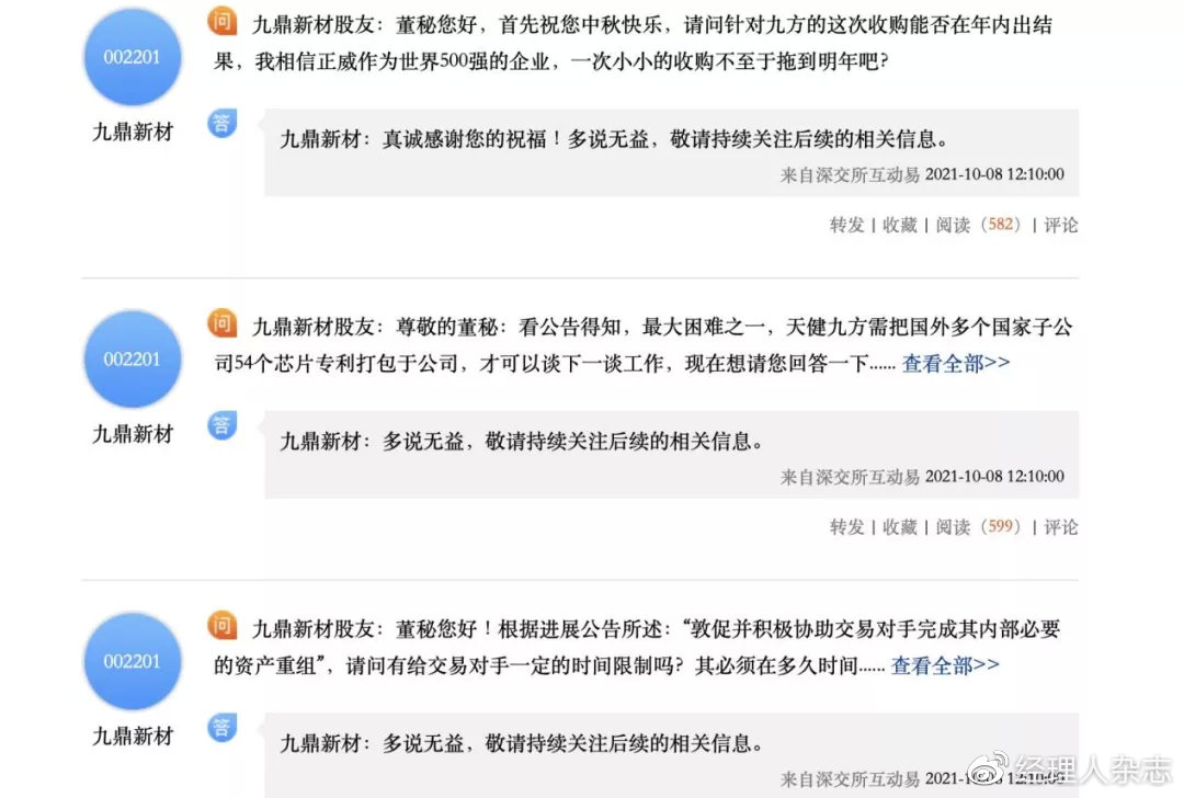 仅10月8日这一天,九鼎新材(002201.SZ)董秘就在互动易上回复了股友14个“多说无益”,董秘回答态度突变瞬间引起了广泛关注与热议,这其中到底发生了什么?