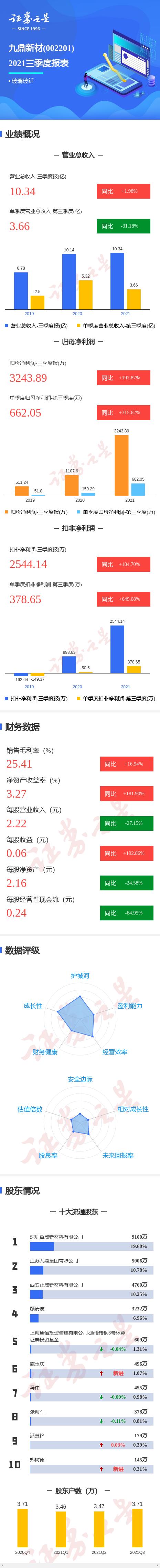 九鼎新材2021三季报显示,公司主营收入10.35亿元,同比上升1.98%;归母净利润3243.9万元,同比上升192.87%;扣非净利润2544.15万元,同比上升184.7%;其中2021年第三季度,公司单季度主营收入3.67亿元,同比下降31.18%;单季度归母净利润662.05万元,同比上升315.62%;单季度扣非净利润378.66万元,同比上升649.68%;负债率56.73%,投资收益229.48万元,财务费用3313.87万元,毛利率25.41%。