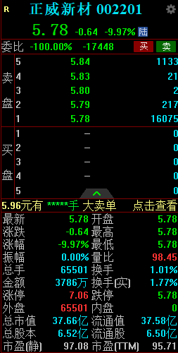5月27日消息,正威新材一字跌停,截至发稿报5.78元/股,成交额3796万元,总市值37.66亿元。