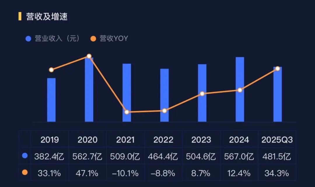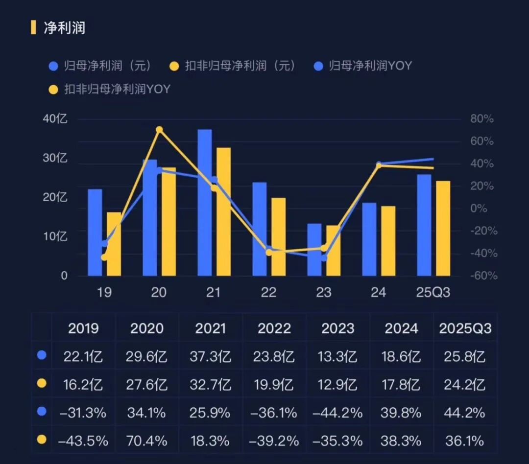 2021-2022年,受行业价格战和原材料价格上涨双重挤压,盈利能力大幅下滑。2023年开始企稳,2024年明显回升,2025年前三季度则呈现爆发式增长。