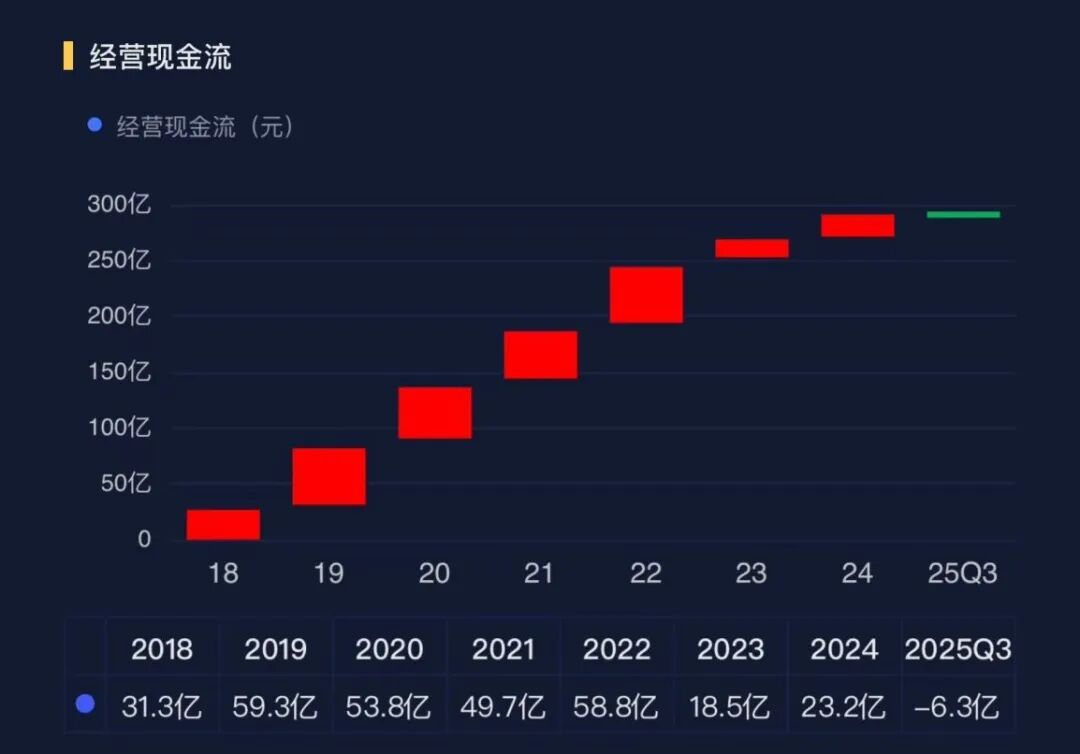 通常来说,其现金流入通常集中在四季度,以往全年的经营净现金流一直保持流入状态,还是很好看的。2025年前三季度的经营性净现金流-6.3亿元,同比2024年同期的-15.9亿元也有大幅改善。