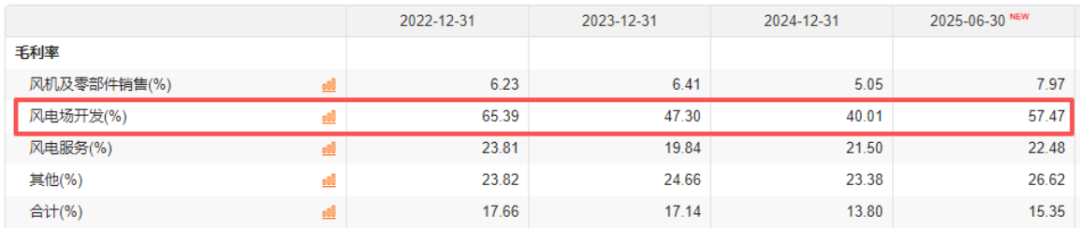 从业务结构看,风机及零部件销售仍是公司的核心收入来源。2025年上半年,该业务实现营收218.5亿元,占总营收的76.6%;风电场开发和风电服务分别贡献31.7亿元和29.0亿元,占比分别为11.1%和10.2%。