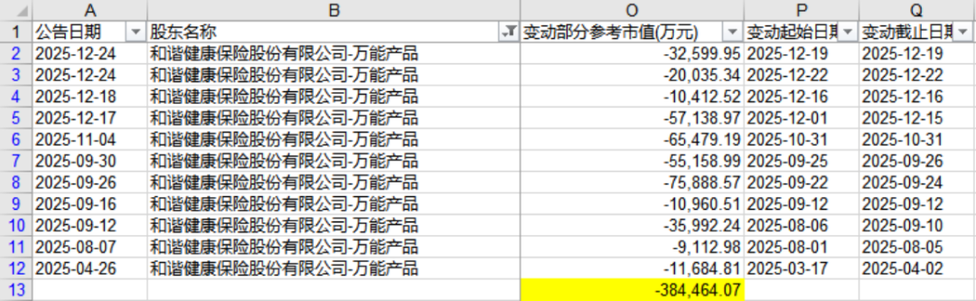 根据公告,和谐健康保险股份有限公司-万能产品(以下简称“和谐健康保险”)在2025年进行了多次减持,到目前为止已累计减持2.75亿股,累计套现金额高达38亿。