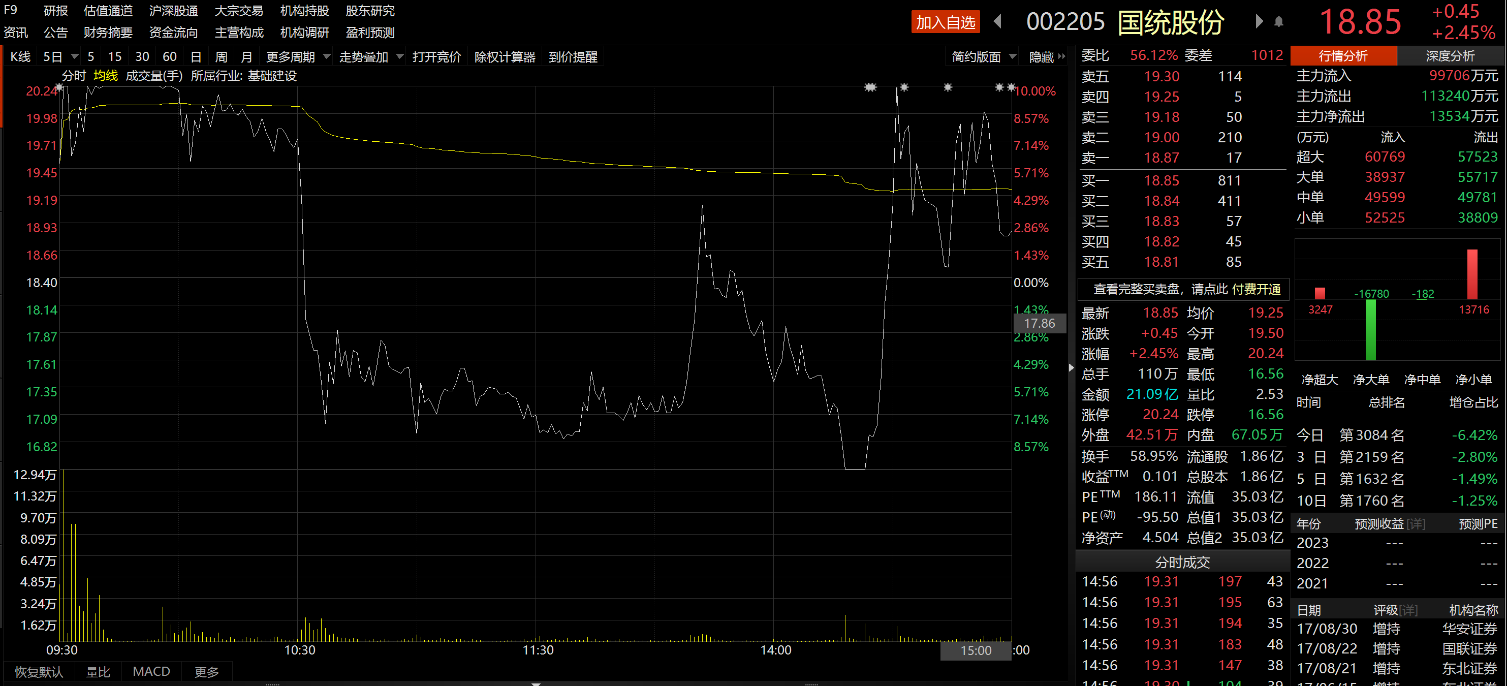 财联社(上海,编辑木子)讯,国统股份大幅高开短暂封住涨停,一度实现八天七板,但此后大幅跳水跌超8%。午后短暂触及跌停,上演“天地板”,但不久反身向上暴拉触及涨停,演绎“地天板”,随后又开板并大幅回吐涨幅。截至收盘,国统股份涨2.45%,全天成交额21亿元;换手率将近60%,位居A股第二位。
