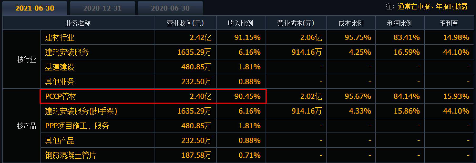 公开资料显示,国统股份主营业务包括预应力钢筒混凝土管(PCCP)、各种输水管道及其异型管件和配件、地铁盾构环片等水泥制品的制造、运输及相关的技术开发和咨询服务和PPP项目。按产品来看,2021年上半年PCCP管材营业收入2.4亿元,占总营收的90.45%。