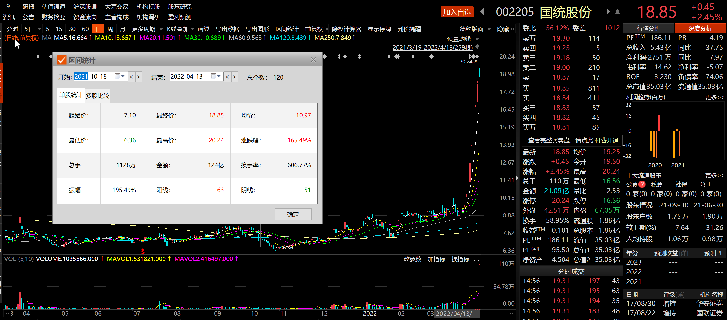 拉长时间看,国统股份自去年10月份低点6.36元至今累计最高涨幅达218%。