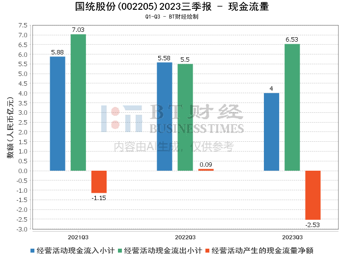 在资产负债方面,根据2023年三季报显示,国统股份的总资产由上年度末的42.66亿元减少至39.63亿元,负债总额从33.33亿元降至31.56亿元,净资产也有所下降,从9.33亿元减至8.07亿元。资产负债率略有上升,从78.13%增加到79.63%。这些变化主要受到货币资金减少、应收款项融资增加、预付款项和存货增长、在建工程扩大、短期借款和应付票据减少等因素影响。