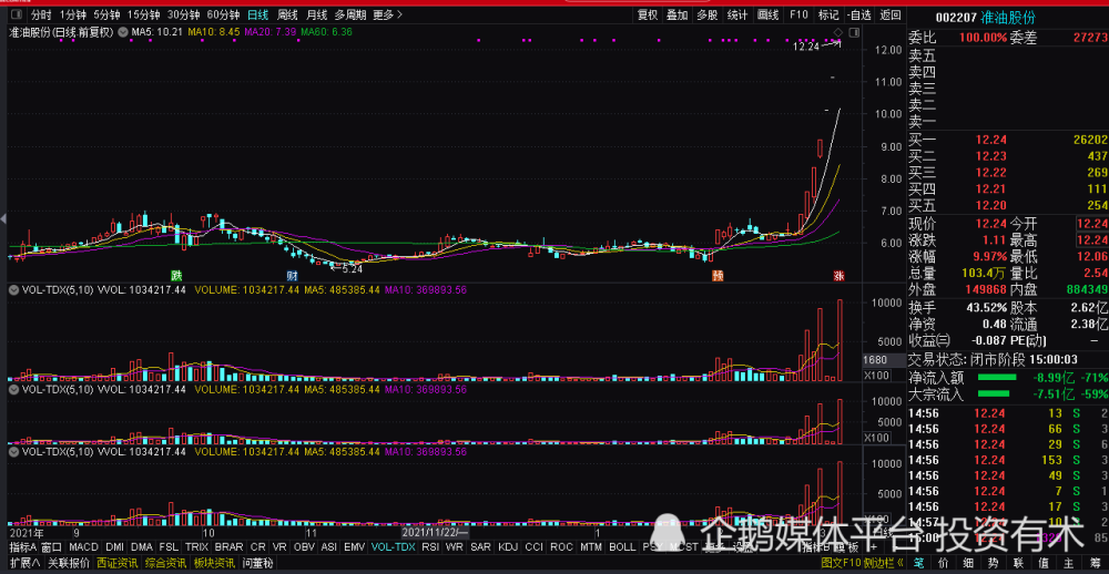 而最近两周以来,市场最强的板块当属油气板块无疑,市场高度板则属于新晋妖王——准油股份,截至上周五,该股已经连续7日涨停,但上周五该股盘中多次开板,换手高达43.52%,且连续涨停天数已经来到了7这个生死线,要知道,按照A股以往的炒作思路,7板是一道门槛,过了往往能成就妖王,过不了,很多就只能走“A”字型了。