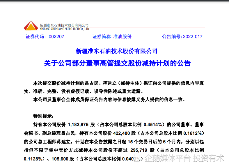 资金封板的不够坚决,让追高买入的投资者忐忑不安,尤其是晚间,上市公司还发布公告称,董监高拟进行减持,至此,不少人认为准油股份或许要止步7连板了!他们聊以自慰的是拟减持的股数不高,合计只有40万股左右,占公司总股本比例才0.15%,这相对周五的成交1亿多股来说,占比实在是比较低,影响并不是很大。