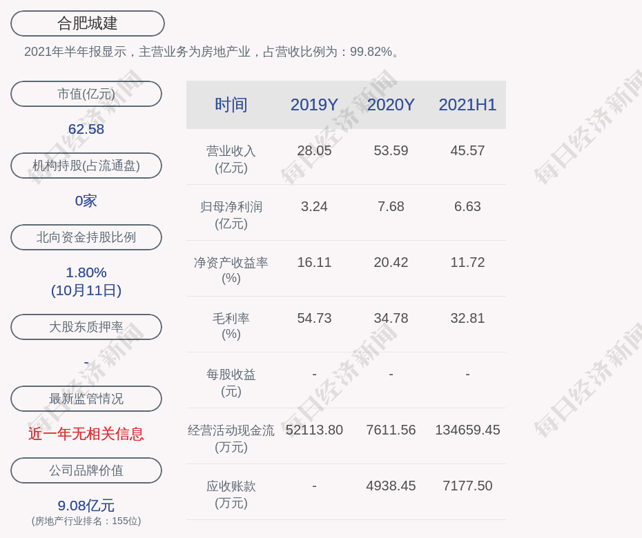 2021年半年报显示,合肥城建的主营业务为房地产业,占营收比例为:99.82%。