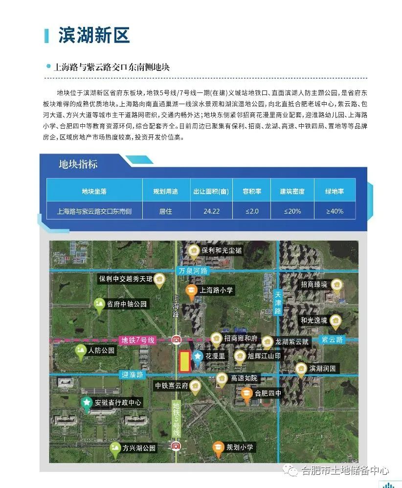 滨科城BK202301号地块位于滨湖科学城上海路以东、紫云路以南,土地面积24.22亩,规划居住,容积率≤2.0,起始价1980万/亩;居住最高限价2275万元/亩;