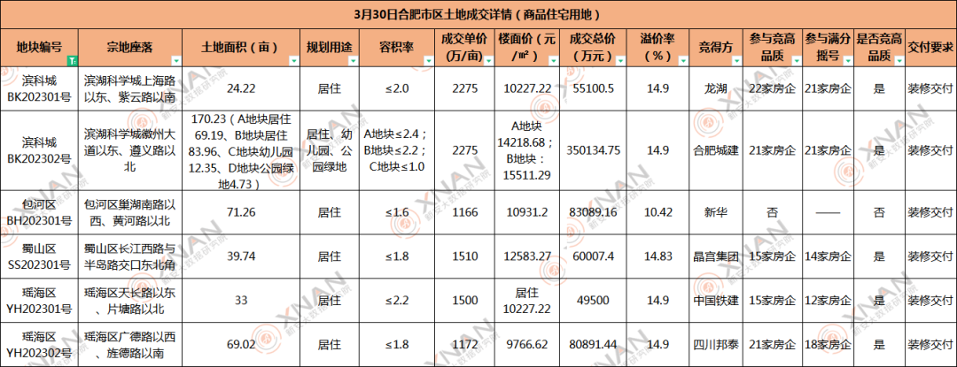 中铁建摇得瑶海区YH202301号地块,居住成交单价1500万元/亩,总价49500万元,楼面价10227.22元/平米,溢价率14.94%。