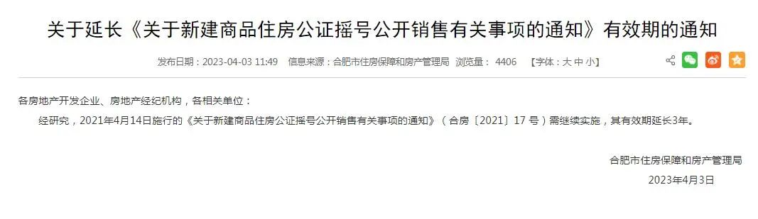 今天,合肥市住房保障和房产管理局发布关于延长《关于新建商品住房公证摇号公开销售有关事项的通知》有效期的通知。