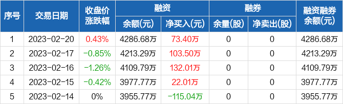 融资方面,当日融资买入410.55万元,融资偿还337.15万元,融资净买入73.4万元,连续4日净买入累计330.91万元。融券方面,融券卖出0股,融券偿还0股,融券余量0股,融券余额0元。融资融券余额合计4286.68万元。