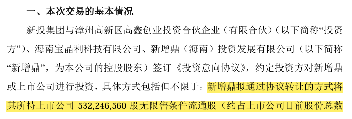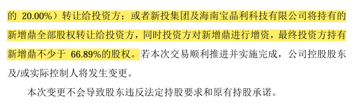 二是新投集团及宝晶利将持有的新增鼎全部股权转让给高鑫创投,同时高鑫创投对新增鼎进行增资,最终持有新增鼎不少于66.89%的股权。