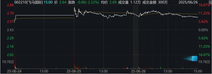 6月24日,深圳市飞马国际供应链股份有限公司(下称飞马国际,002210.SZ)高开高走,开盘不到10分钟就一字涨,最终收报2.67元/股,涨幅9.88%。6月25日开盘后,飞马国际股价继续走高,最高达到2.8元/股,创新60日最高纪录,当日收于2.7元/股。经过两日“狂欢”,6月26日公司股价未再持续上升势头,最终收于2.64元/股,较前一日下跌2.22%。