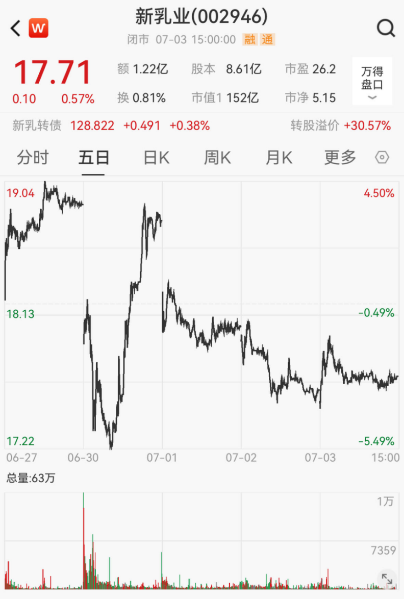 减持公告披露后,新乳业股价连跌三日。截至7月3日收盘,新乳业报17.71元/股,微涨0.57%,总市值约152亿元。