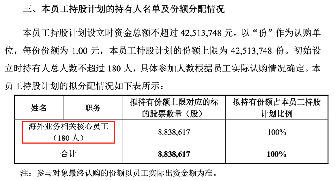 2024年12月2日晚间,该公司发布2024年员工持股计划草案,计划面向180名海外业务相关核心员工,推出规模为883.86万股的员工持股计划;购买价格为4.81元/股,较草案公布前120个交易日的公司股票交易均价折价50%。