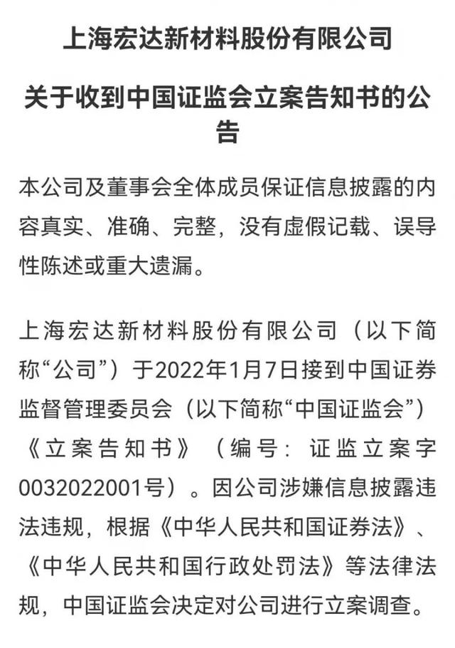 二零二二年一月七日,上海宏达新材料股份有限公司收到中国证监会《立案告知书》。