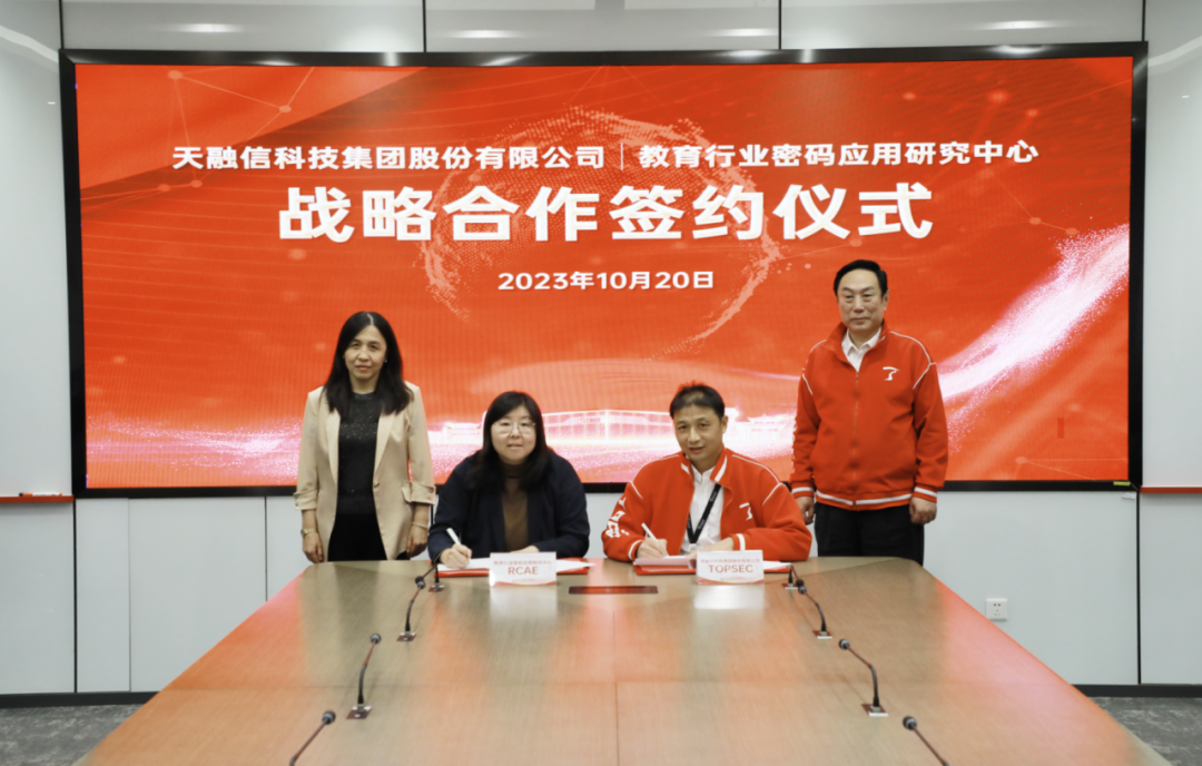近日,天融信科技集团(以下简称“天融信”)与教育行业密码应用研究中心达成战略合作,共同推动国产密码技术在教育行业的应用。教育行业密码应用研究中心(山东)主任、山东大学网络空间安全学院常务副院长王美琴教授,教育行业密码应用研究中心副主任、北京交通大学计算机与信息技术学院信息安全系副主任黎琳,天融信科技集团高级副总裁景鸿理、副总裁寇增杰等出席签约仪式。