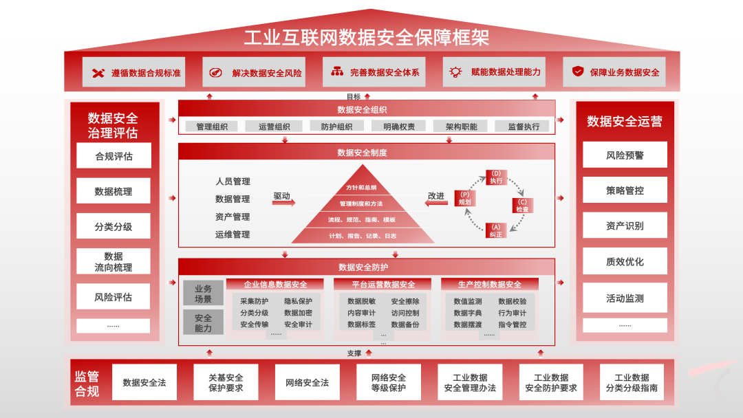 天融信基于在工业互联网领域的持续深耕实践,提出“工业互联网数据安全保障框架”。从监管合规的角度出发,聚焦应用现状、数据资产等业务场景,开展评估梳理找出安全风险,建立符合业务需求的数据安全目标;根据治理评估结果补充完善数据安全组织和管理制度,明确定义数据安全权责边界,保障管理手段执行落地;通过构建基于IPDRR安全框架的数据安全技术体系作为数据安全防护的技术支撑,持续监测数据安全风险,快速响应安全事件;同时以业务为中心建立数据安全运营管理流程,打造长期性、持续性的运营服务,对业务系统数据的全生命周期进行管理。