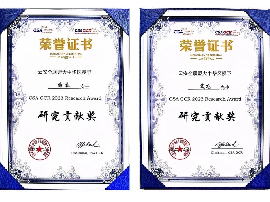 CSA 2023年度表彰仪式上,天融信科技集团助理总裁谢琴、战略与咨询中心总监艾龙荣获研究贡献奖,同时,天融信也是受聘专家最多的企业。天融信还参与了本次《基于IAM的数据安全技术研究》、《数据分类分级实践指南》两大报告编写工作,基于在天融信深厚的数据安全实践经验,充分发挥在数据安全领域的专业水准。