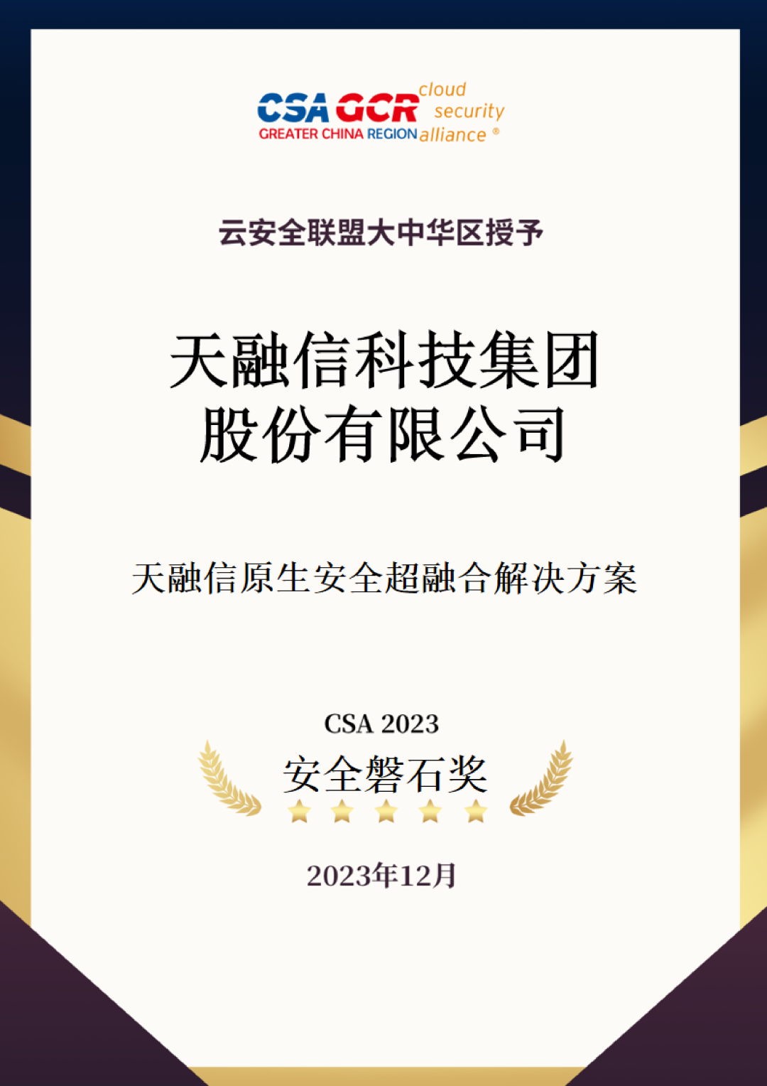 此次大会上,《天融信原生安全超融合解决方案》斩获CSA 2023安全磐石奖。安全磐石奖旨在表彰对数字安全核心挑战提出了体系化、前瞻性的综合解决方案,本次获奖也是对天融信“云+安全”融合创新实践的高度认可。未来,天融信将继续发挥自身安全优势,持续打造“安全原生的国产化云”。