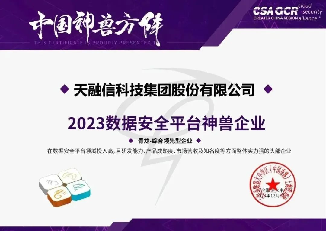 会上,《数据安全平台神兽方阵报告(2023)》报告正式发布。凭借在数据安全领域的强劲综合实力,天融信入选2023数据安全平台·青龙神兽企业。据了解,“青龙-综合领先型企业”是指在数据安全平台领域投入高,且研发能力、产品成熟度、市场营收及知名度等方面整体实力强的头部企业。