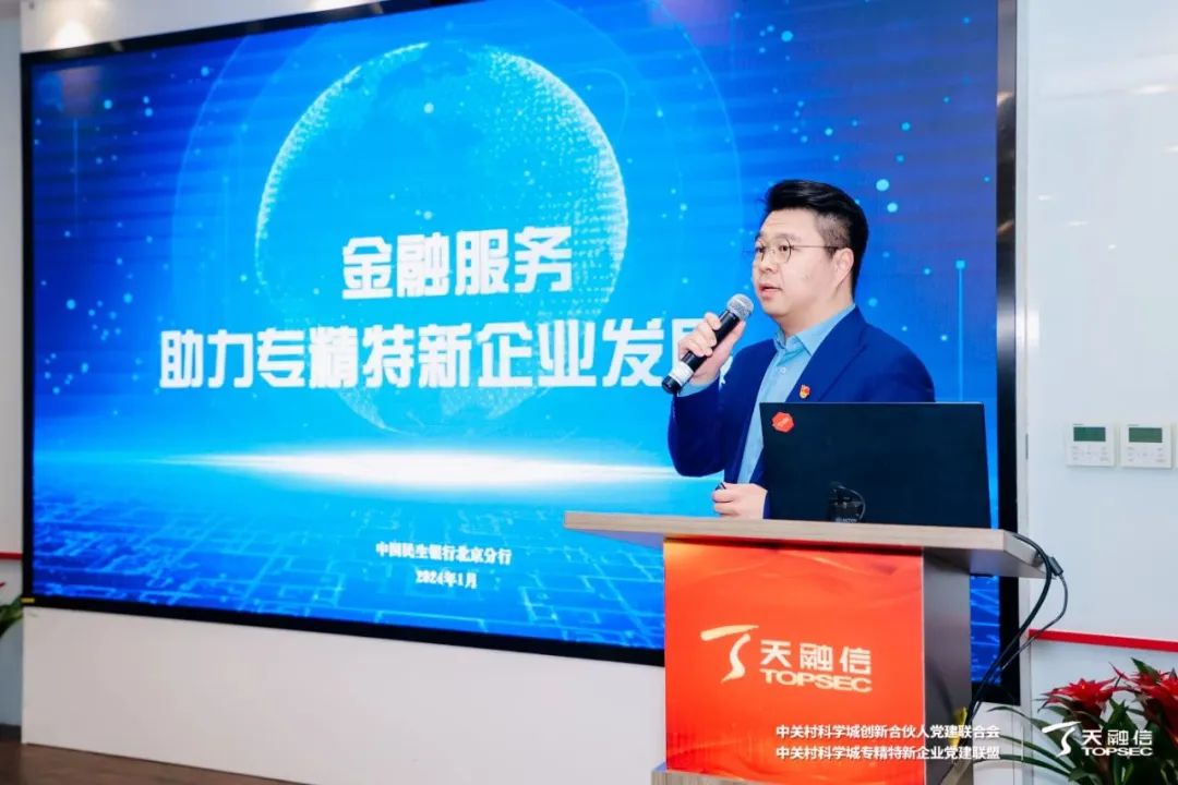 中国民生银行北京中关村分行副行长张坤、北京中关村分行科创金融部总经理王荣斯、北京分行高级经理刘雅丽一行为专精特新企业讲解金融服务和案例分享。