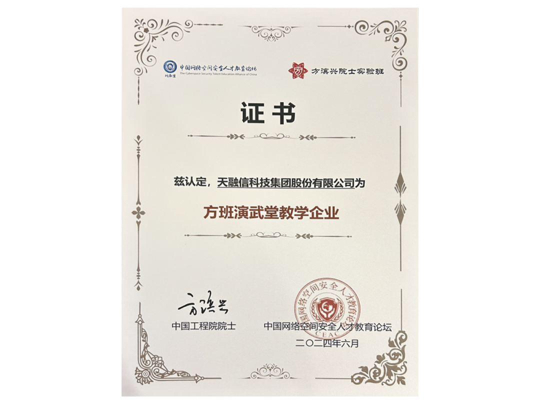 8月9日,2024年网络安全技术创新与人才教育高峰论坛圆满举行,天融信科技集团董事长兼CEO李雪莹博士出席作主旨分享,天融信参编的《网络空间安全工程技术人才培养体系指南(综合版)》正式发布。作为活动研讨会之一的“方班网安人才培养新模式研讨会”同期举办,天融信科技集团作为“方班演武堂”的重点支撑单位,获评“方班演武堂教学企业”,同时,天融信科技集团总工程师吴亚飚参与主题研讨。