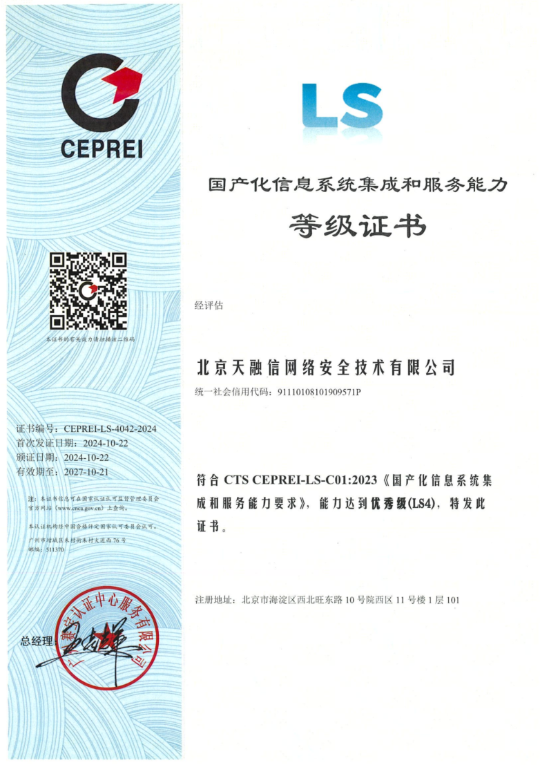 近日,天融信顺利通过国产化信息系统集成和服务能力评估的最高等级(LS4 优秀级)认证,标志着公司在信创领域的技术、产品、项目集成等综合能力获得专业认证机构的认可,也为更进一步推动信息系统集成国产化的发展奠定了坚实的基础。