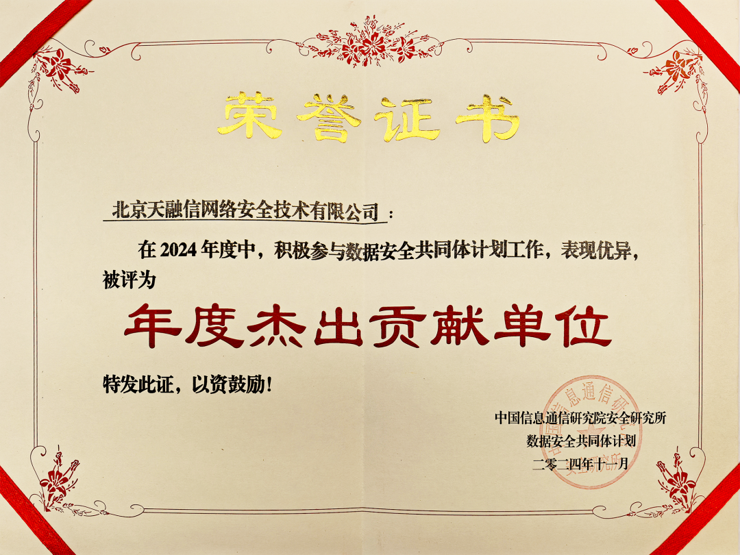 会上公布了年度优秀成员单位/个人名单,并颁发证书。继2021年被评为数据安全共同体计划“优秀参与单位”后,天融信在2022年、2023年、2024年连续三届获评“年度杰出贡献单位”,累计四届蝉联最高荣誉。同时,天融信科技集团四位专家凭借卓越表现,荣获“年度杰出专家”称号,数量位居企业之首。