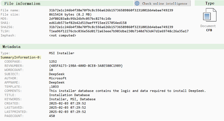 近期,就有安全研究人员发现黑客组织利用DeepSeek的热度,伪装成其客户端安装程序进行钓鱼攻击。经分析,该恶意模块的代码特征与BumbleBee恶意软件家族高度相似,通过伪造的MSI安装程序,释放并加载恶意模块,执行恶意代码。