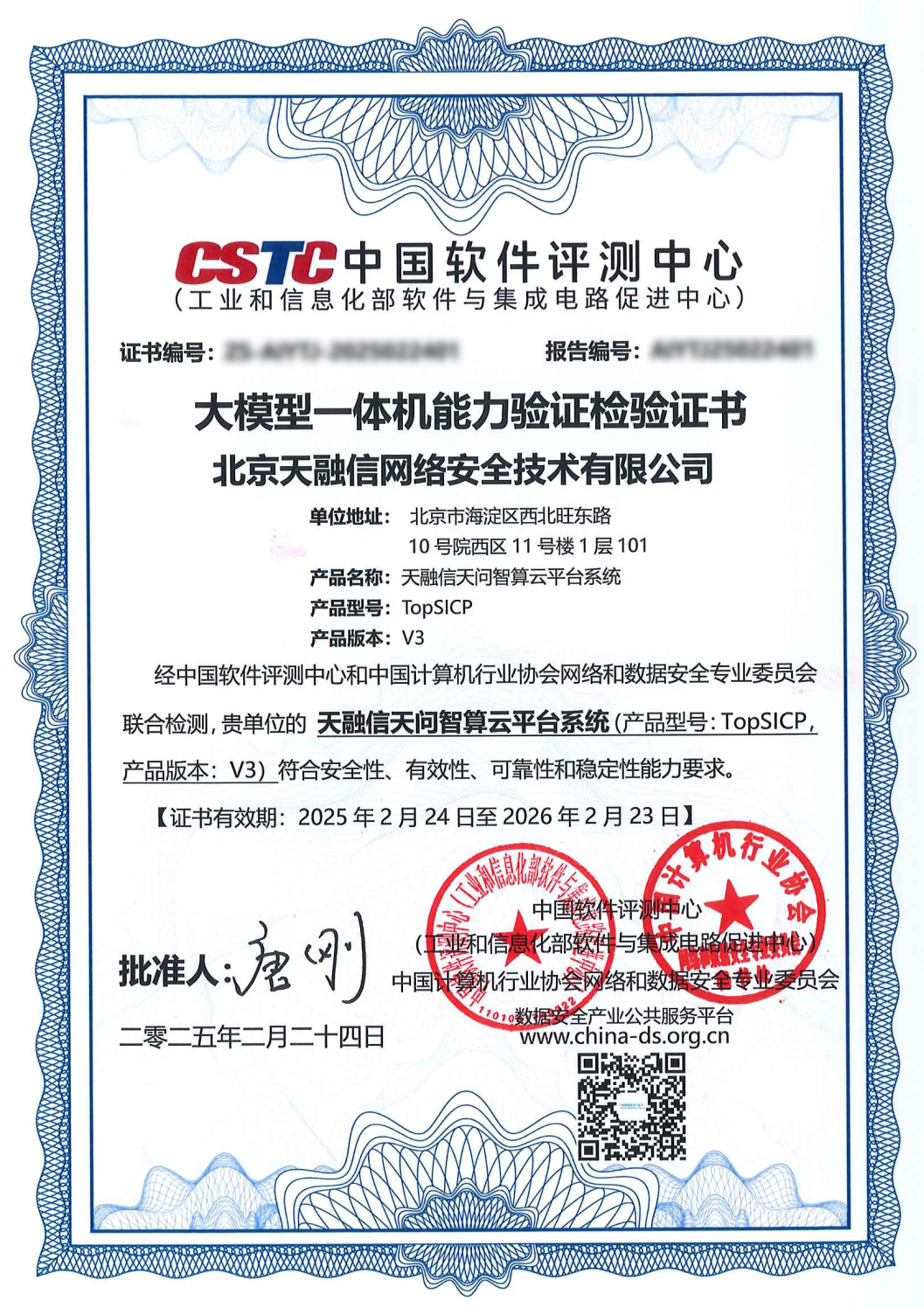 近日,天融信自主研发的天问智算云平台系统首批通过中国软件评测中心(工业和信息化部软件与集成电路促进中心)的大模型一体机能力验证。天融信安全智算一体机搭载天问智算云平台软件,在可靠性、稳定性、安全性与有效性四大维度均达技术标准,综合实力得以完美体现。