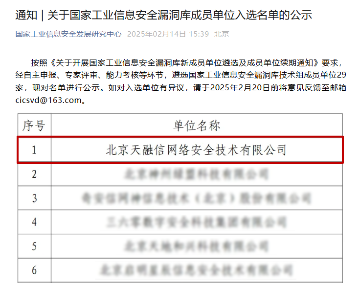 近日,国家工业信息安全发展研究中心国家工业信息安全漏洞库(简称“CICSVD漏洞库”)公示国家工业信息安全漏洞库(CICSVD)成员单位名单,天融信凭借在工业信息安全领域多年来的技术积累与专业能力再度入选CICSVD漏洞库技术组成员单位,至此已连续5届入选。