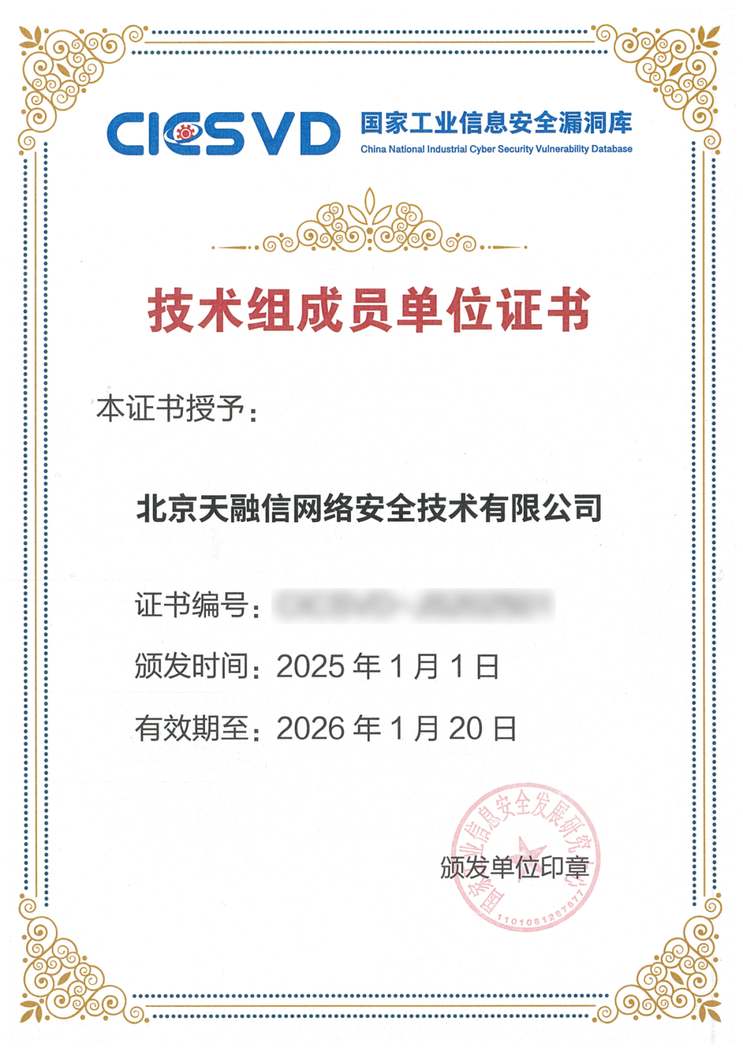 多年来,作为CICSVD漏洞库技术组成员单位,天融信积极参与漏洞库的共建共享,在原创漏洞挖掘、漏洞验证等方面提供了高质量的技术支持,并通过公告、培训等形式提升公众对信息安全漏洞的认知与防范能力,携手业界同仁,共同提升我国网络安全防护水平。同时,天融信还积极参与CICSVD各项技术支撑活动,得到CICSVD漏洞库高度认可与肯定,为提升我国工业信息安全防护体系提供专业技术支撑。