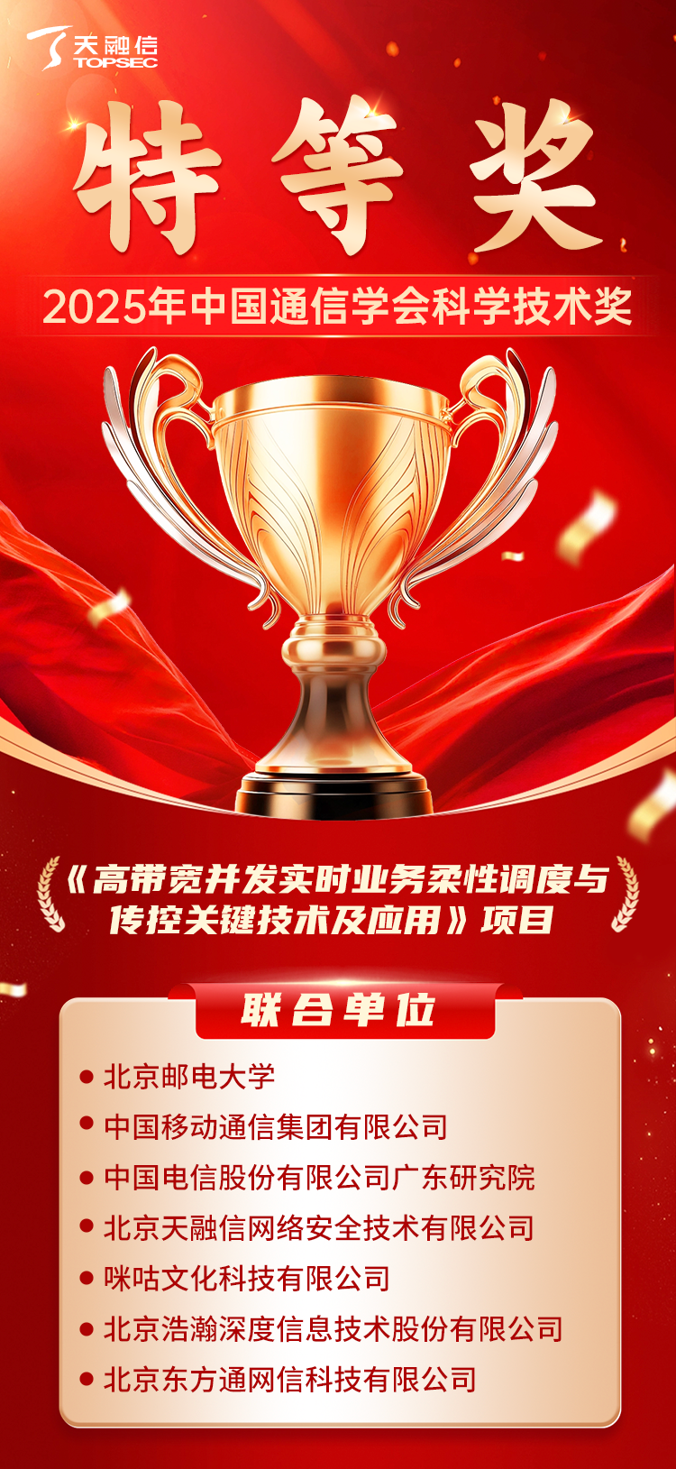 近日,2025年中国通信学会科学技术奖评审结果公示,天融信科技集团联合北京邮电大学等单位申报的《高带宽并发实时业务柔性调度与传控关键技术及应用》项目,成功斩获特等奖。