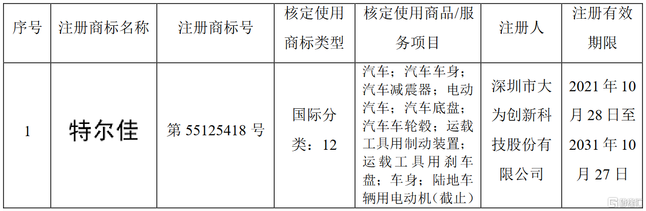 大为股份(002213.SZ)公布,近日,公司收到国家知识产权局颁发的1项《商标注册证书》,公司控股子公司深圳市芯汇群微电子技术有限公司(“芯汇群”)收到国家知识产权局颁发的1项《发明专利证书》、7项《实用新型专利证书》、1项《外观设计专利证书》,具体情况如下: