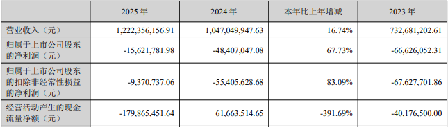 2023年、2024年、2025年,大为股份的营业收入分别为7.33亿元、10.47亿元、12.22亿元;归属于上市公司股东的净利润分别为-6662.61万元、-4840.70万元、-1562.18万元;归属于上市公司股东的扣除非经常性损益的净利润分别为-6762.77万元、-5540.56万元、-937.07万元;经营活动产生的现金流量净额分别为-4017.65万元、6166.35万元、-1.80亿元。
