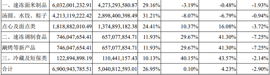 主营业务分产品情况方面,速冻面米制品的营业收入为60.32亿元,同比下降3.19%,毛利率为29.16%,同比下降1.93%;速冻调制食品的营业收入为7.46亿元,同比上涨29.67%,毛利率为11.93%,同比下降7.25%;冷藏及短保类的营业收入为1.23亿元,同比上涨40.15%,毛利率为10.13%,同比下降2.14%。