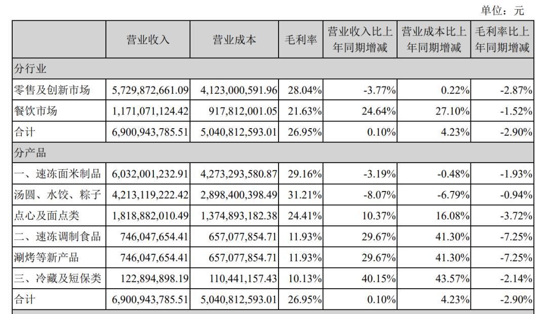 2021年报显示,三全食品全年实现营业收入69.43亿元,同比增长0.25%;实现归母净利润6.41亿元,同比下降16.55%