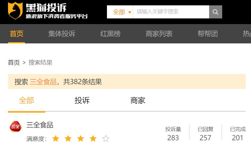 蔡先生在三全速冻食品中吃出异物的案例并非少数。黑猫投诉平台显示,与三全食品相关投诉高达382条,投诉内容包括“脾豆沙粽子里吃到黄色异物”“水饺中发现头发”“黄米汤圆中吃到小石子”等。