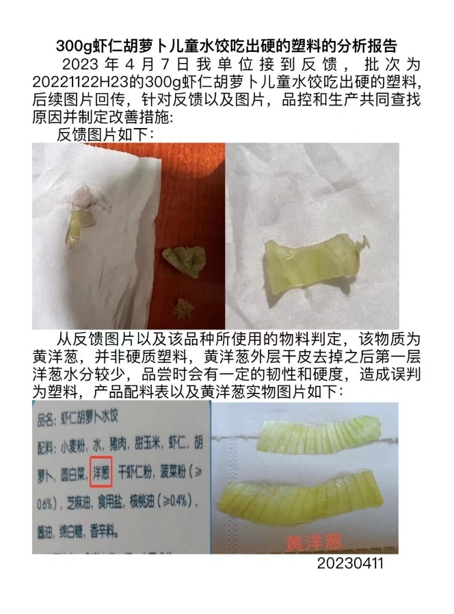4月13日,蔡先生收到了三全公司根据照片进行鉴定从而出具的《300g虾仁胡萝卜儿童水饺吃出硬的塑料的分析报告》。