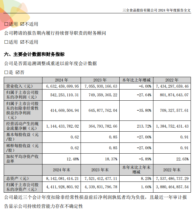 日前,三全食品发布了2024年财报。报告显示,公司总营业收入为66.32亿元,同比下降6%;归母净利润为5.42亿元,同比下降27.64%。这一业绩与五年前其作为速冻食品行业龙头企业的辉煌形成鲜明对比。