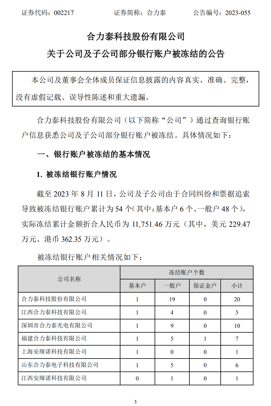 合力泰表示,当前正在积极与相关债权人进行沟通,通过融资置换、债务展期、分批还款等方式化解债务逾欠问题,同时公司正在加快回收应收账款、处置资产等方式全力筹措偿债资金,缓解资金压力制定,待股转事项落地后,将尽快恢复授信额度的正常使用,及时解决上述债务逾期问题,争取尽快恢复被冻结银行账户正常状态。