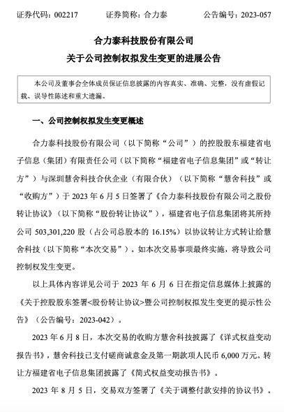 公告称,公司的控股股东福建省电子信息(集团)有限责任公司(以下简称“福建省电子信息集团”或“转让方”)与深圳慧舍科技合伙企业(有限合伙)(以下简称“慧舍科技”或“收购方”)于2023年6月5日签署了《合力泰科技股份有限公司之股份转让协议》(以下简称“股份转让协议”),福建省电子信息集团将其所持公司503,301,220股(占公司总股本的16.15%)以协议转让方式转让给慧舍科技(以下简称“本次交易”)。如本次交易事项最终实施,将导致公司控制权发生变更。