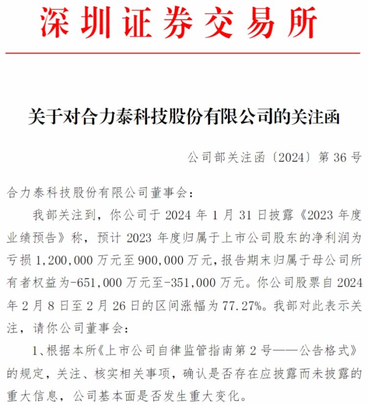 深交所指出,合力泰于2024年1月31日披露《2023年度业绩预告》称,预计2023年度归属于上市公司股东的净利润为亏损120亿元至90亿元,报告期末归属于母公司所有者权益为-65.1亿元至-35.1亿元。公司股票自2024年2月8日至2月26日的区间涨幅为77.27%。