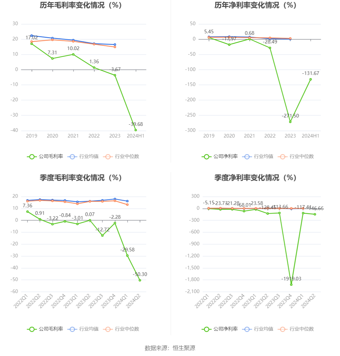 2024年上半年,公司毛利率为-39.68%,同比下降38.04个百分点;净利率为-131.67%,较上年同期下降61.37个百分点。从单季度指标来看,2024年第二季度公司毛利率为-50.30%,同比下降50.37个百分点,环比下降20.72个百分点;净利率为-146.66%,较上年同期下降18.21个百分点,较上一季度下降29.25个百分点。