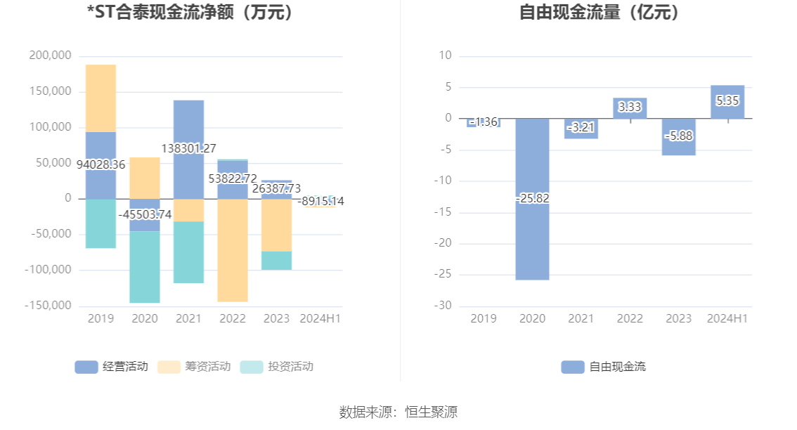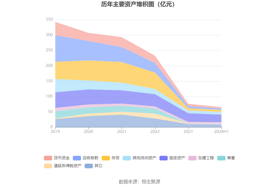 2024年上半年,公司经营活动现金流净额为-8915.14万元,同比减少1.97亿元,主要系本期营收规模下降,客户回款减少,同时资金紧张、支付减少等综合影响所致;筹资活动现金流净额-2787.74万元,同比增加4.69亿元,主要系本期银行授信使用受限,收到借款减少,同时资金紧张、债务逾期,偿债减少等综合影响所致;投资活动现金流净额5024.55万元,上年同期为-1.3亿元,主要系本期收回退购资产款,资金紧张、管控投资活动支出,减少现金支付等综合影响所致。