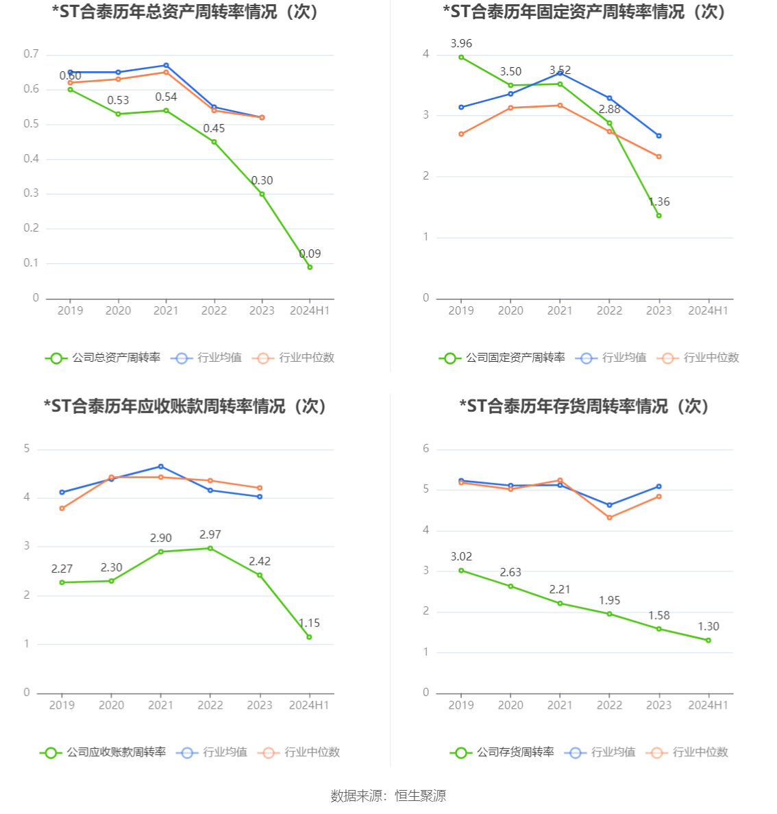 营运能力方面,2024年上半年,公司总资产周转率为0.09次,上年同期为0.16次(2023年上半年行业平均值为0.24次,公司位居同行业32/40);公司应收账款周转率、存货周转率分别为1.15次、1.30次。